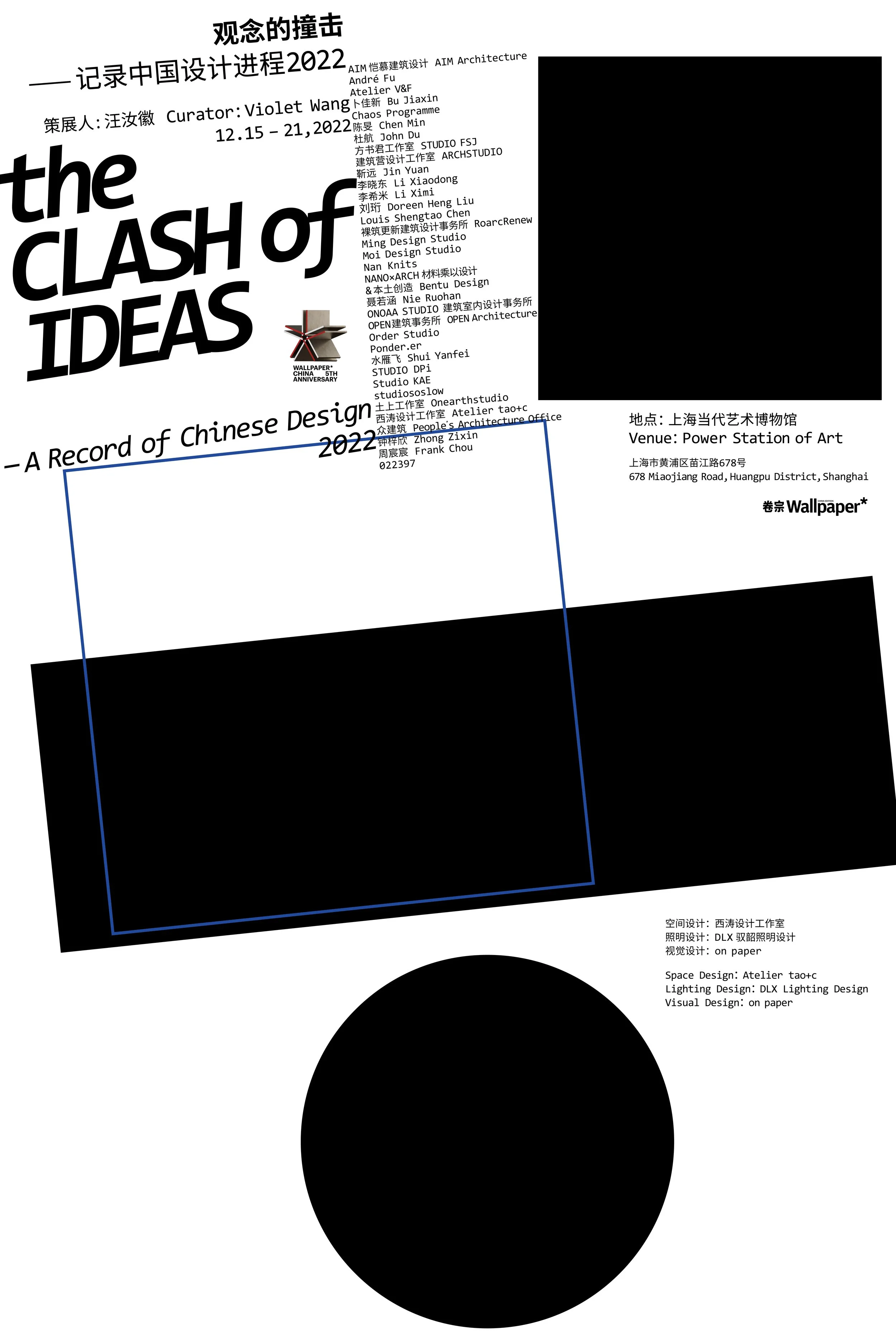 《卷宗Wallpaper*》五周年及2022年“卷宗Wallpaper*设计大奖”举办之际, 特邀策展人汪汝徽以“中国当下设计现场”为主题,在中国最权威的现当代美术馆上海当代 艺术博物馆(Power Station of Art)策划展览。在疫情之后的特殊时期,汪汝徽以“提问” 的方式构建了本次展览,她向34位/组活跃在中国当下设计现场且有重要影响力的设计师 (涵盖了建筑、产品、时装、珠宝、手工艺、平面设计与出版、电子设备等各领域),提出了围绕 “视觉经验与实体经验、个人与社群、工作室与工厂、地方与世界”四大方向的问题,邀请设计师 从各自的思想与实践出发,展开回应,以实物、图像、文字、图纸的形式,呈现在展览的现场, 构建出“观念的撞击”。